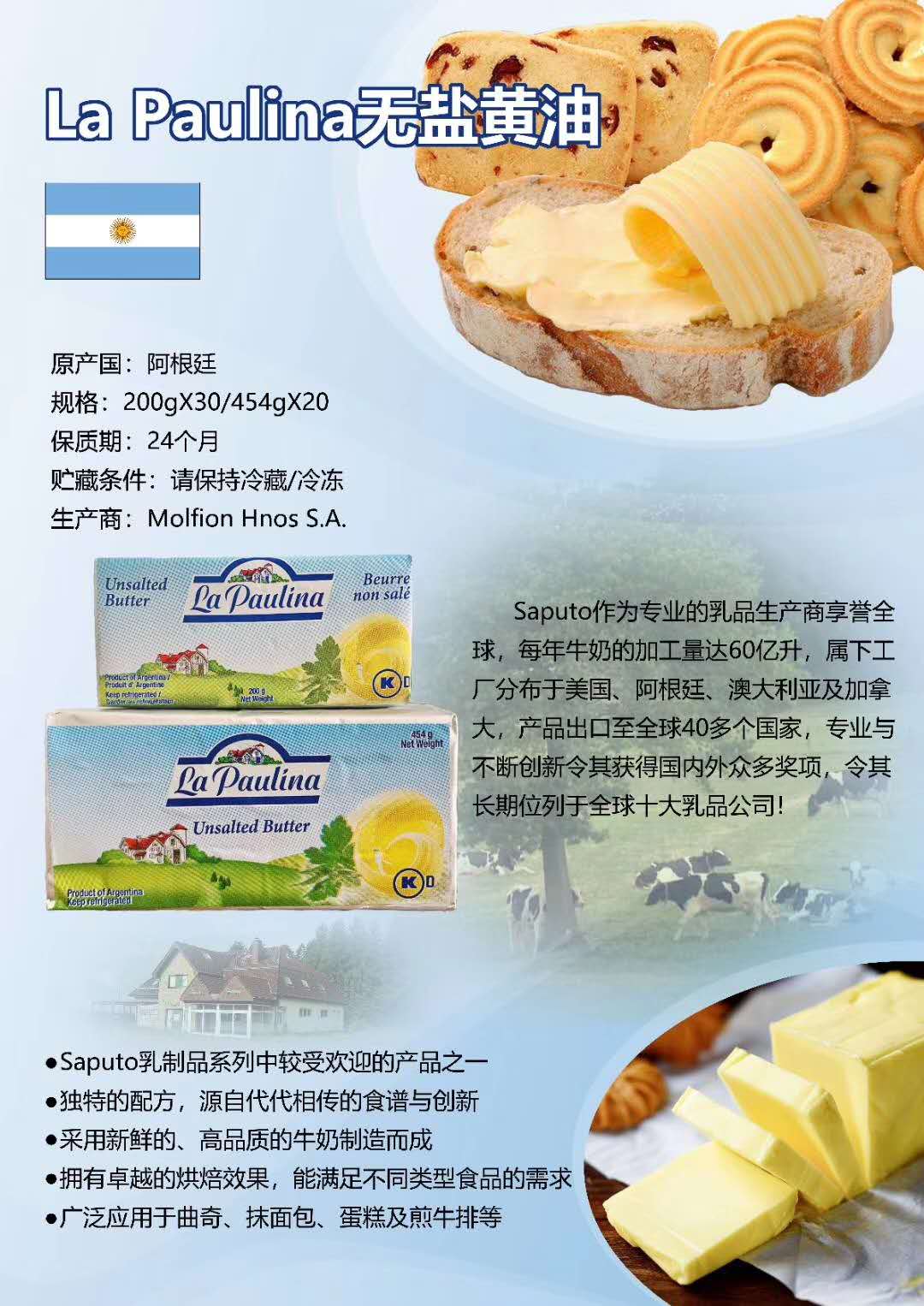 阿根廷La Paulina无盐黄油 20*454g /30*200g